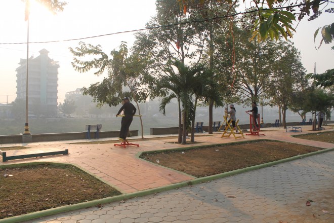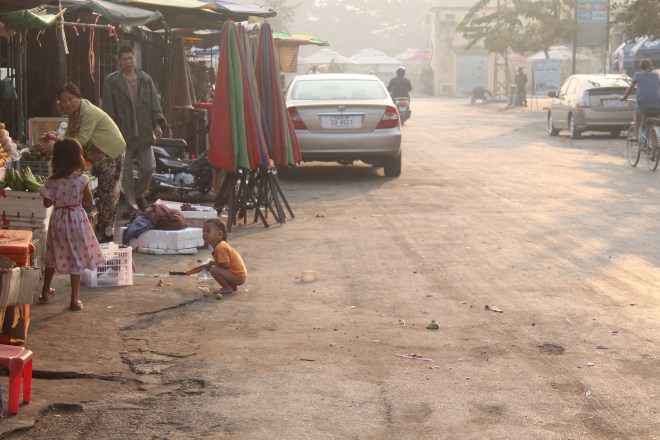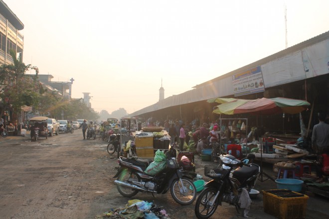 Damit ich noch den ersten Bus nach Siem Reap nehmen konnte, bin ich recht früh aufgestanden und hatte dann noch zwei Stunden Zeit mir Battambang beim Erwachen anzuschauen. Shops machen sich bereit für den Tag, der Markt ist schon in vollem Gange, Straßenhändler verkaufen Insekten und Muscheln zum Frühstück und Heerscharen von Kindern springen auf der Straße rum, die Alten machen auf den Blechgeräten Frühsport. Ich kam mir als Tourist fast vor wie ein Eindringling.
