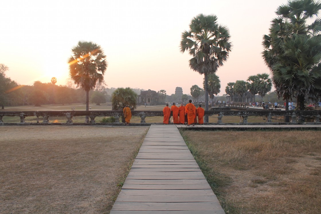 Heilfroh in Siem Reap angekommen zu sein, wollte ich das noch das Meiste aus dem angefangenen Tag machen und hab mich zum Sonnenuntergang von einem TukTuk nach Angkor Wat fahren lassen. Wenn man ein Ticket für den nachfolgenden Tag kauft, darf man sich den Sonnenuntergang umsonst ansehen. Der Sonnenuntergang war ganz nett, der Tempel schön – aber die Magie von diesem Ort ist da noch nicht so bei mir angekommen. Stattdessen sind mir die Riesigen Touristengruppen, Kokosnuss- und Guidebook Führer aufgefallen. Als ich mich dem Gewusel entziehen wollte und bei einem kleinen Tempel kurz hingesetzt habe, haben mich plötzlich 10 aufgeregte Chinesinnen mit riesigen Kameras fotografiert. Beautiful Girl, Look here! No, Look to me. Smile!! Oh so Pretty. Wer sich mal wie ein Popstar fühlen sollte, blonde Haare scheinen da zu helfen. Zugegebenermaßen, die Fotos die die Damen gemacht haben waren sehr gut. John, mein TukTuk Fahrer hat auf mich gewartet und mich wieder zurück gefahren.