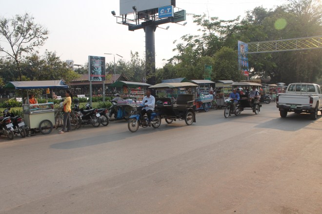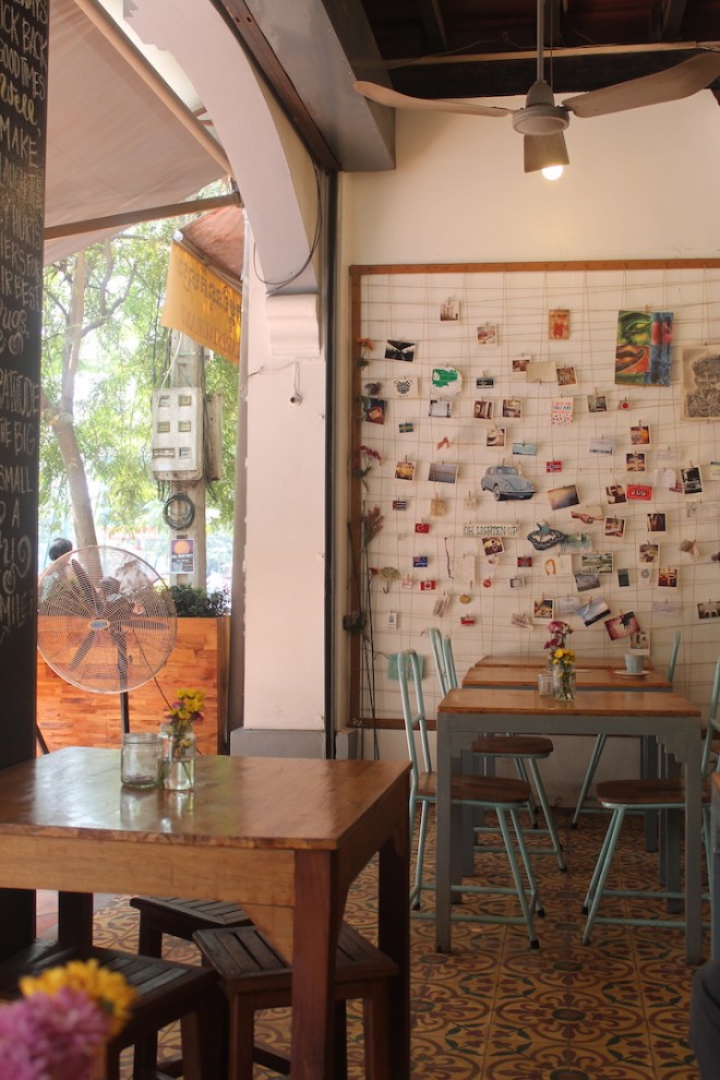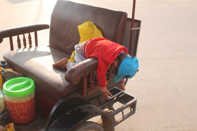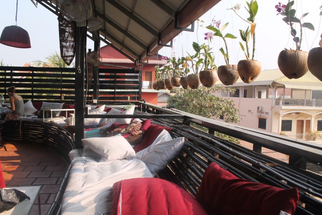 Ich glaube, es ist wichtig sich auch mal ein „Wochenendtag“ zu gönnen. Ein Tag an dem man sich abends fragt, was man eigentlich den ganzen Tag gemacht hat und wie dieser so schnell vorbei gehen konnte. Ich hab an meinem letzten Tag in Siem Reap ausgeschlafen, in einem wunderschönen Cafe gefrühstückt. Gelesen, gefrühstückt, auf dem Fenster geschaut, Musik gehört. Ich hab mit fast niemandem geredet, hab keinen meine Story erzählt, niemandem nach Tips für irgendwas gefragt, sondern war einfach nur da. Hab den TukTuk und Moto Fahrern zugeschaut, wie sie versucht haben Kundschaft zu locken, Kindern beim rumtollen zugeguckt und bin zum Nachmittag wieder in das gleiche Cafe und plötzlich war es dunkel.