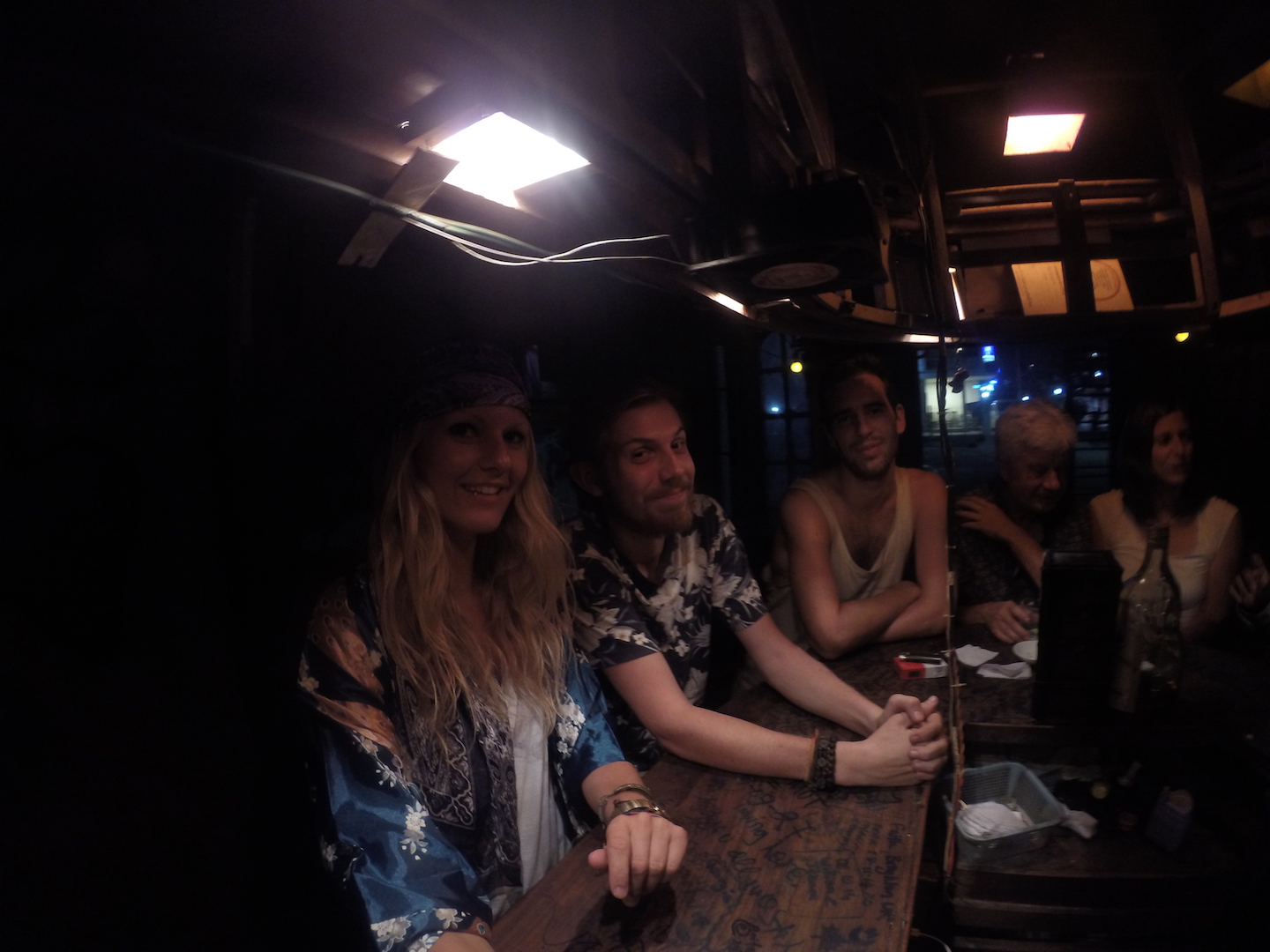 Ich kann im Nachhinein kaum erklären warum sich dieser Abend so rund, so glücklich angefühlt hat – so als wären wir genau zu perfekten Zeit am richtige Ort gelandet. Den Whiskey Sour schienen wir direkt im Abo gebucht zu haben, das Glas blieb nie lange leer. Der Helm-Mann versuchte immer wieder zu gehen, kaum aus der Tür raus, kam er gleich wieder reingestolpert, nahm unter schallendem Gelächter der anderen wieder Platz und bekam ein neues Glas hingestellt. Das Spielchen wiederholte sich drei Mal. Beflügelt vom Whiskey wollten wir dem Gitarren-Mann dann beibringen mit uns und für uns Wonderwall von Oasis zu spielen. Die Schweizer und der Franzose unterstützen uns lautstark. Krumm und schief sagen wir in dieser Kleiderschrank-Kneipe mit drei Burmesen Wonderwall und freuten uns des Lebens.