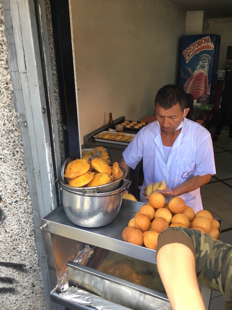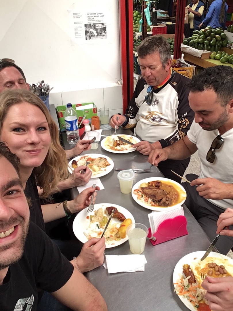Sicherheit war von Anfang an ein Thema bei uns beiden aber auch bei unserem Guide. Bevor wir zu dem Markt kamen, zeigte er uns aus der Ferne das gefährlichste Viertel von Bogota. Unsere Fahrräder parken wir für den Marktbesuch in einer großen Shoppingmall auf einem extra eingerichteten Fahrrad Parkplatz. Der Markt war eine Halle mit festen Ständen und mittendrin gab es unser Mittagessen an einem klitzekleinen Stand, bei dem wir zu siebt grade so an einen Tisch passten.