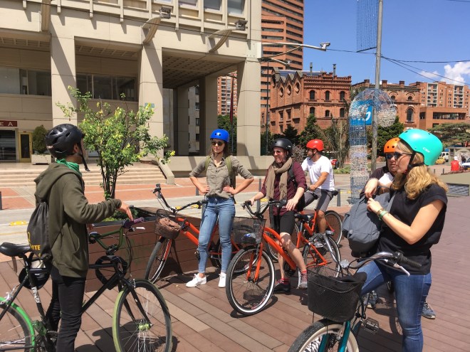 Wir kamen am Abend in Bogota an, Geld holen klappte einwandfrei. Der Taxifahrer, der uns vom Flughafen zum Hostel brachte, hatte uns natürlich zu viel Geld abverlangt, eigentlich lief also alles wie gewohnt. Im Hostel war nur noch ein Nachtwächter, der uns das Zimmer öffnete und so wachten wir am nächsten Tag – dank Zeitumstellung auch entsprechend früh – einfach in Kolumbien auf. Wir sprangen unter die Dusche, konnten uns noch für die Free Bike Tour vom Hostel anmelden und liefen dann zum Supermarkt um uns Frühstück zu besorgen.