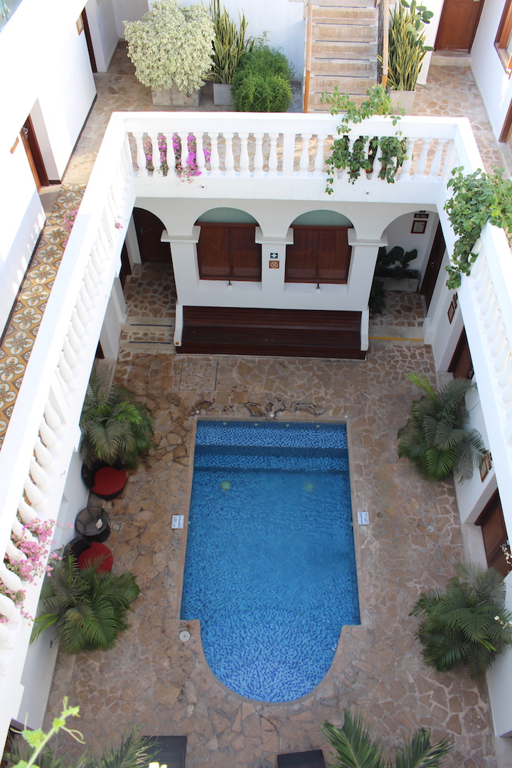 Im Minivan ging es am Morgen entlang der Küste in die 240 Kilometer entfernte Hafenstadt Santa Marta. Wir checkten in unser Hostel ein – definitiv eins der schönstens Hostels in dem ich je war. Das herrschaftliche, große Haus mit vielen verwinkelten Ecken hatte einen großen Pool, der quasi der Innenhof war und eine Dachterrasse mit Ausblick auf die Stadt, einer Bar und offener Küche zum selber Kochen – bei dem Blick macht draußen frühstücken im Januar noch mal mehr Spaß.
