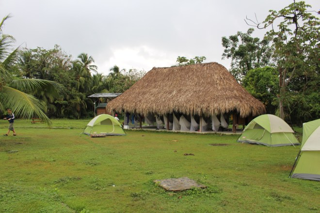 Nachdem wir alle Gebühren und Transfers gebucht hatten, brachte uns ein anderer Minivan weiter in den Park hinein. Von hier aus konnte man entweder ein sehr mageres Pferd mieten, dass einen in den Park hinein bringt oder eben zu Fuß laufen. Wir schlossen uns den Massen an, und im Gänsemarsch ging es den schmalen Holzweg in den Urwald entlang. Die Hitze – grade nach einem kurzen Regenschauer – war beinahe unerträglich. Am frühen Mittag erreichten wir unseren ersten Campingplatz; wir verbrachten insgesamt zwei Nächte im Park auf zwei verschiedenen Campingplätzen. Wenn man kein eigenes Zelt hat, kann man dort entweder ein bereits aufgestelltes Zelt mieten, oder – wie wir – in den Hängematten schlafen.