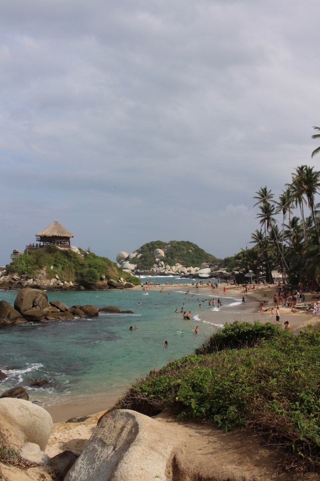 Tagsüber waren wir an den verschiedene Stränden, die der Park zu bieten hat. Der berühmteste Strand ist der an unserem zweiten Campingplatz names „Cabo San Juan“; wenn man Bilder von Kolumbiens Karibikküste sucht, findet man mit hoher Wahrscheinlichkeit auch ein Bild von dieser Bucht. Die Natur im Park ist wirklich beeindruckend, ein dichter Urwald, palmungesäumte Strände und unwirkliche Steinformationen. Aber grade in Cabo San Juan ist der Strand für die Touristenhorden nicht ausgelegt, man liegt Handtuch an Handtuch und die Lifeguards pfeifen unermüdlich Leichtsinnige aus dem Wasser, die zu weit rausschwimmen.