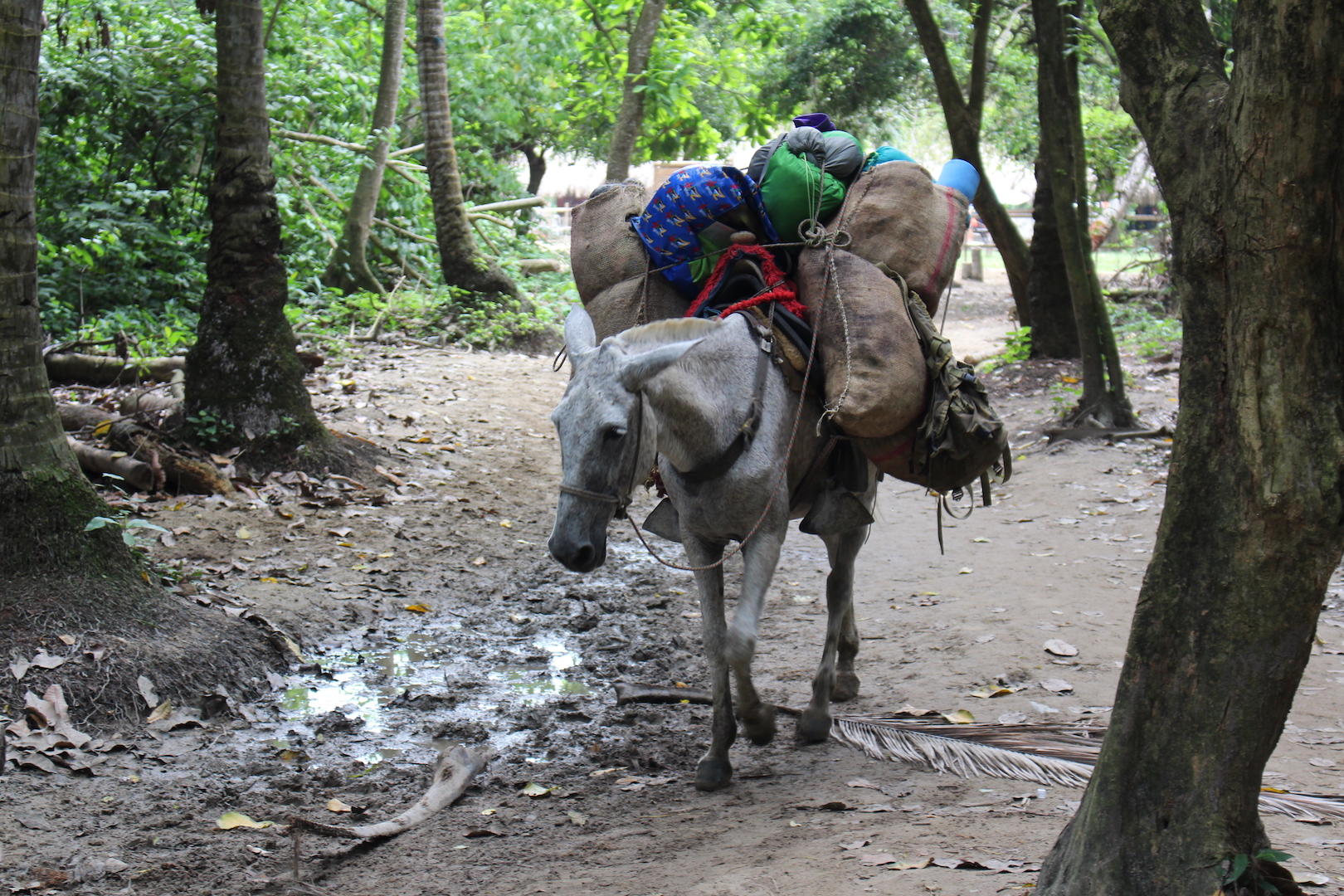Um genug Zeit zu haben und etwas antizyklisch unterwegs zu sein, standen wir also vor 6:00 Uhr auf, packten unser Handgepäck und liefen den Weg zurück. Wir waren tatsächlich mal die einzigen, die unterwegs waren und konnten die Natur ungestört auf uns wirken lassen. Grade weil der Park bald geschlossen sein sollte und jetzt auch einfach noch Hauptreisezeit war, hätten wir uns denken können, dass dies kein reines Naturerlebnis für uns zwei wird. Sondern dass schöne Fleckchen einfach auch viele Menschen anziehen. Kurz vor dem Ausgang sahen wir noch einen Tapir im Dickicht, gestern hatten wir schon einen sehr entspannten Leguan entdeckt. Der Wanderweg am Morgen hat uns mit Tyrona versöhnt und wir waren sehr froh den Park noch mal von dieser Perspektive zu sehen.