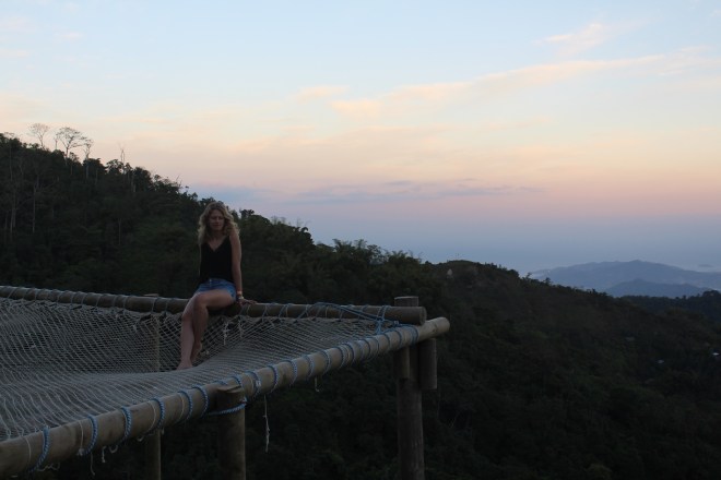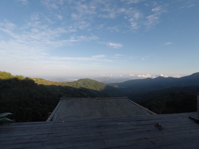 Am nächsten Morgen schlichen wir zum Sonnenaufgang aus dem Schlafsaal und hatten die Hängematte und den unvergleichlichen Blick für uns ganz alleine. Die Sonne kroch langsam über die grünen Berge, die Wolken, die im Tal lagen zogen sich zurück und gaben dann den Blick auf Santa Marta und den Strand frei. Wirklich wunderschön.