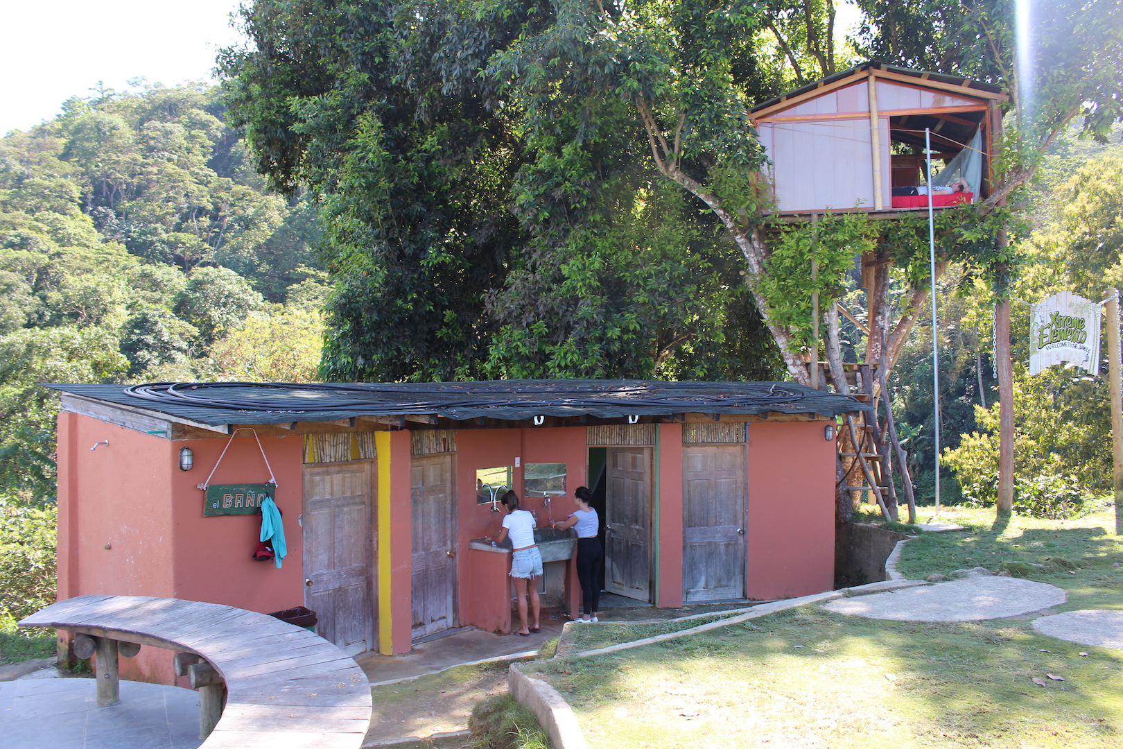 Die Aussicht im Hostel entschädigte augenblicklich für die Anreise, die ich dann auch schon wieder mit Humor nehmen konnte. Während die Schlafsäle im Hostel wirklich nichts besonderes waren, bietet das Hostel auch ein Baumhaus für zwei Personen und drei kleine Cabanas mit ungestörtem Blick in die Natur an. Aus Budgetgründen gab es für uns nur einen dunklen Schlafsaal, aber von dem besonderen Sanitäranlagen profitieren alle. Sowohl die Toiletten als auch die Duschen sind zu einer Seite offen und man kann bei all seinen Erledigungen die Aussieht genießen.
